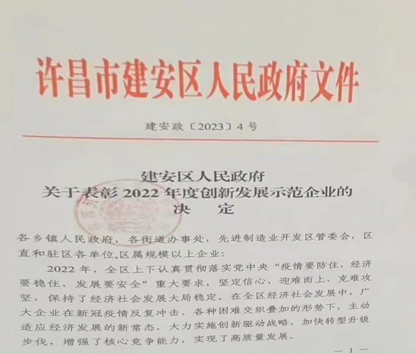 許昌恒生制藥有限公司被選入2022年度創新發展示范企業,2023年01月31日受到許昌市建安區政府表彰。